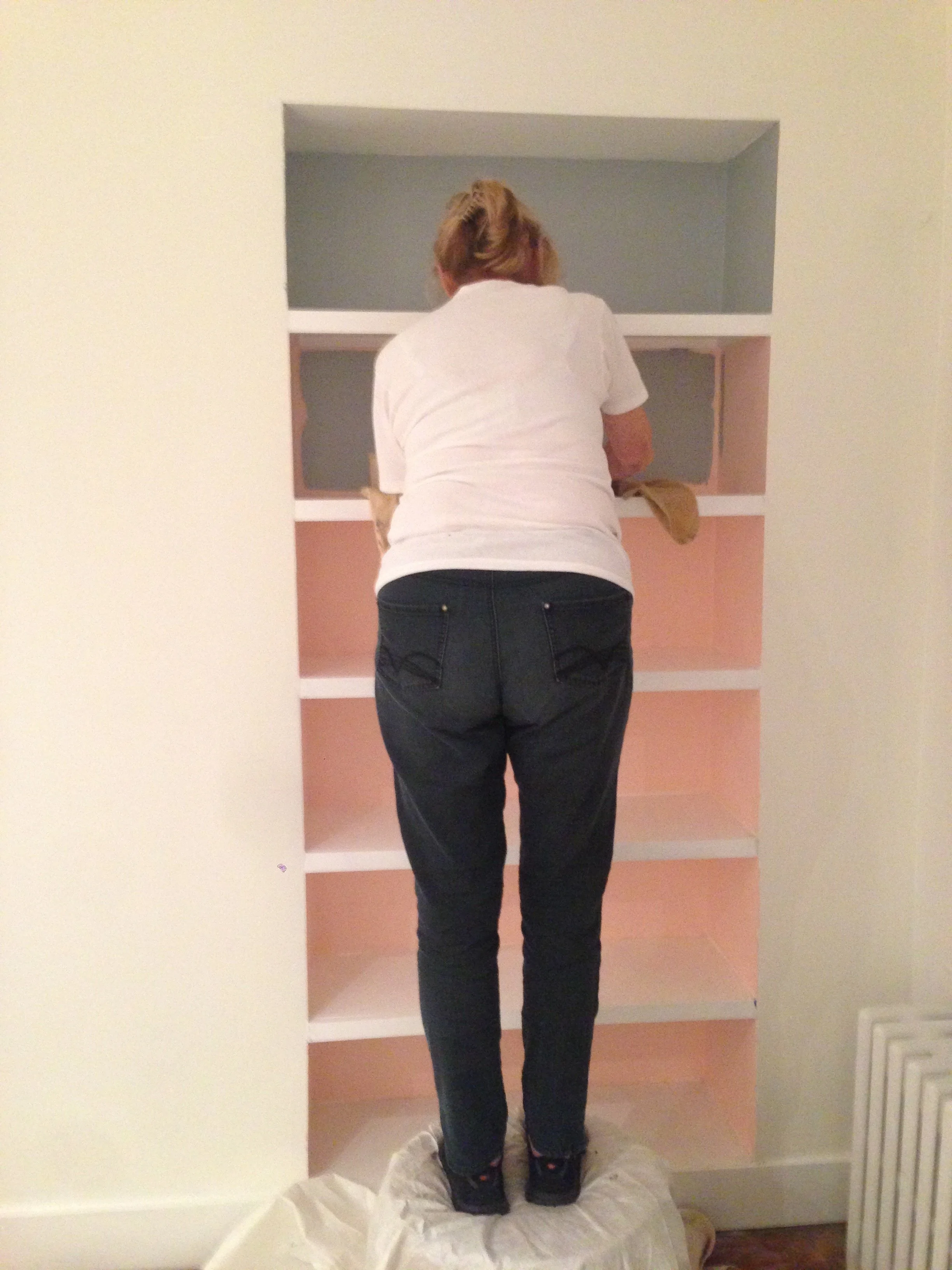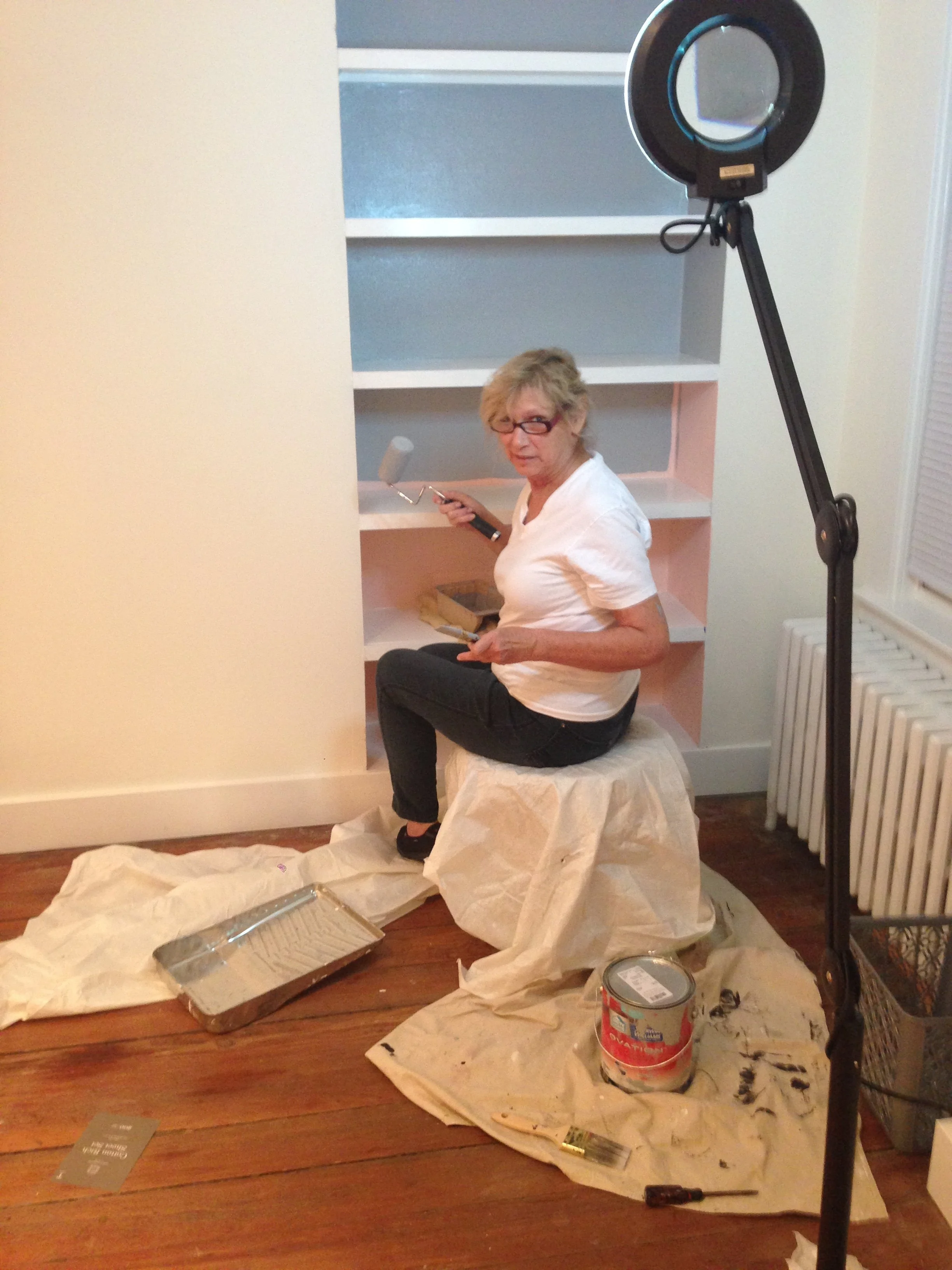 My mom painting shelves in the first office.